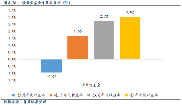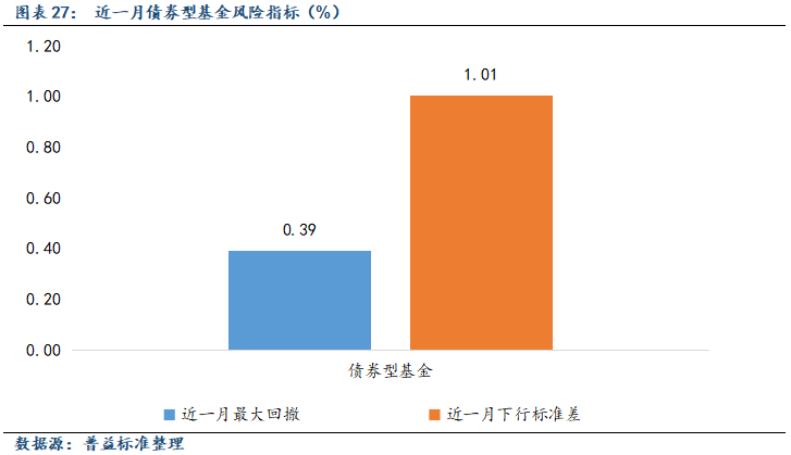 从业绩方面分析,11月债券型公募基金各期限区间年化收益率较上月均有所下降。其中,债券型基金近1月年化收益率跌至负区间,跌幅相对较大。11月,受税期和政府债供给压力影响,流动性压力阶段性凸显,叠加市场短期内降息预期有所弱化,以及部分房企信用风险事件影响,当月中下旬债市呈现一定的回调趋势,带动相关产品近1月收益率上行趋势也相对明显。从风险指标分析,债券型基金本月最大回撤和下行标准差平均值较上月有所上升,主要受当月债市回调波动影响。