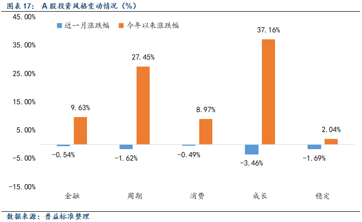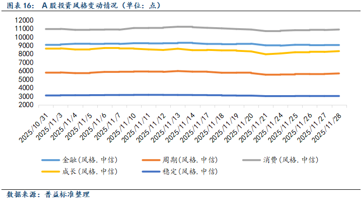 从投资风格来看,11月风格指数全数下跌。具体来看,金融、周期、消费、成长和稳定风格指数分别变动-0.54%、-1.62%、-0.49%、-3.46%和-1.69%。其中消费板块跌幅相对较小,主要是当月《关于增强消费品供需适配性进一步促进消费的实施方案》的发布,对相关板块起到了一定的支撑作用。此外,金融板块跌幅也相对较小,当月在权益市场波动带动市场避险情绪加强的背景下,银行等金融板块的经营稳健性与高股息价值有所凸显。