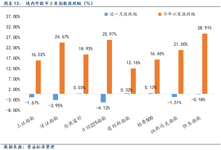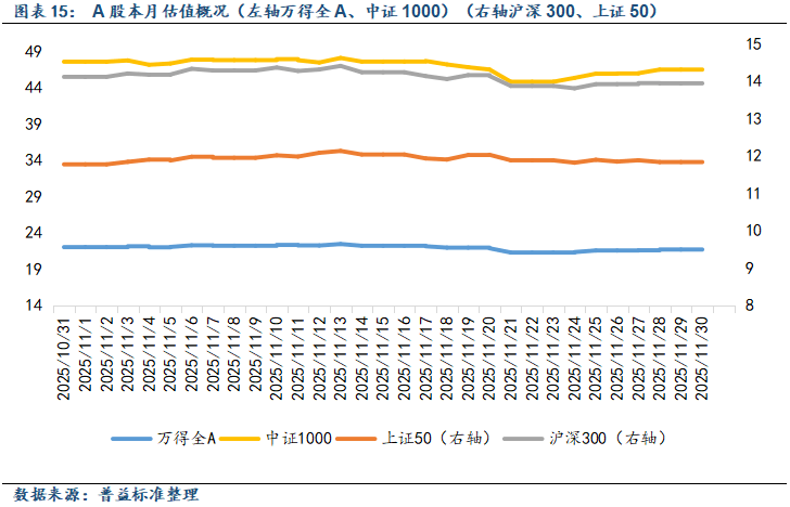 从估值来看,11月市场主要指数估值多数下行,以中证1000为代表的中小板指估值降幅相对较大,代表权重股的上证50估值月末环比小幅上涨。此外,较海外市场而言,国内沪深300、上证50等指数绝对估值仍普遍低于海外核心指数,创业板指的估值水平本月下降明显。其中,上证50指数市盈率分位数处于近10年88%左右,整体处于历史上游水平,较上月小幅上涨;创业板指市盈率分位数降至近10年36左右,下行幅度整体相对较大。