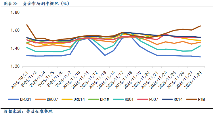 11月,各类利率整体呈现低位震荡走势。细分来看,11月末DR001和DR007利率分别为1.30%和1.47%,环比分别变动-2BP和1BP,11月末R001和R007利率分别为1.43%和1.52%,环比分别变动2BP和3BP,受政府债供给压力以及税期扰动等因素影响,月中左右各类利率短期内波动虽有所加剧,但全月来看整体依然呈现低位波动态势。利差方面,11月末R001-DR001利差收于12BP,R007-DR007利差收于6BP,月末以来利差呈现一定的走阔趋势,银行与非银金融机构之间流动性分层现象仍有体现。