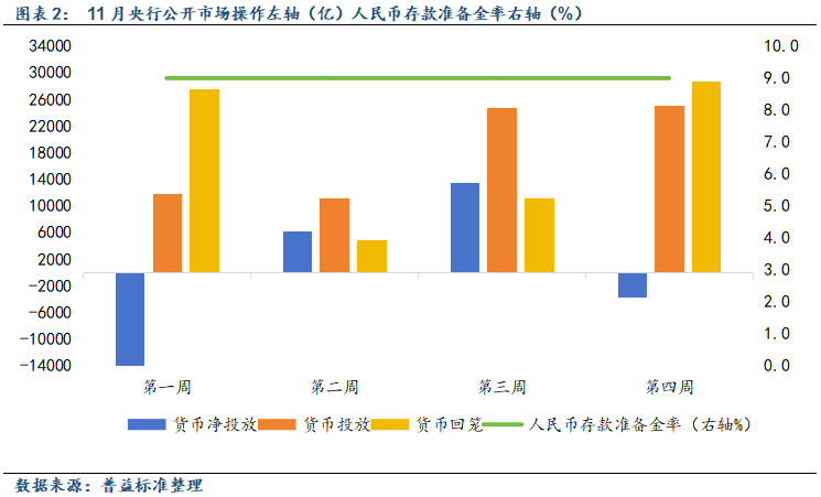 具体的,11月第一周有20680亿逆回购到期,当周仅续作了4958亿逆回购,同时投放了7000亿买断式逆回购,并有7000亿买断式逆回购到期,净回笼资金15722亿;第二周有4958亿逆回购到期,当周续作了11220亿逆回购,净投放资金6262亿;第三周有11220亿逆回购到期,当周续作了16760亿逆回购,并投放了8000亿买断式逆回购,净投放资金13540亿;第四周有16760亿逆回购到期,并有3000亿买断式逆回购到期,央行操作了15118亿逆回购,此外本周央行回收了9000亿MLF,当周MLF投放量为10000亿,净回笼资金3642亿。