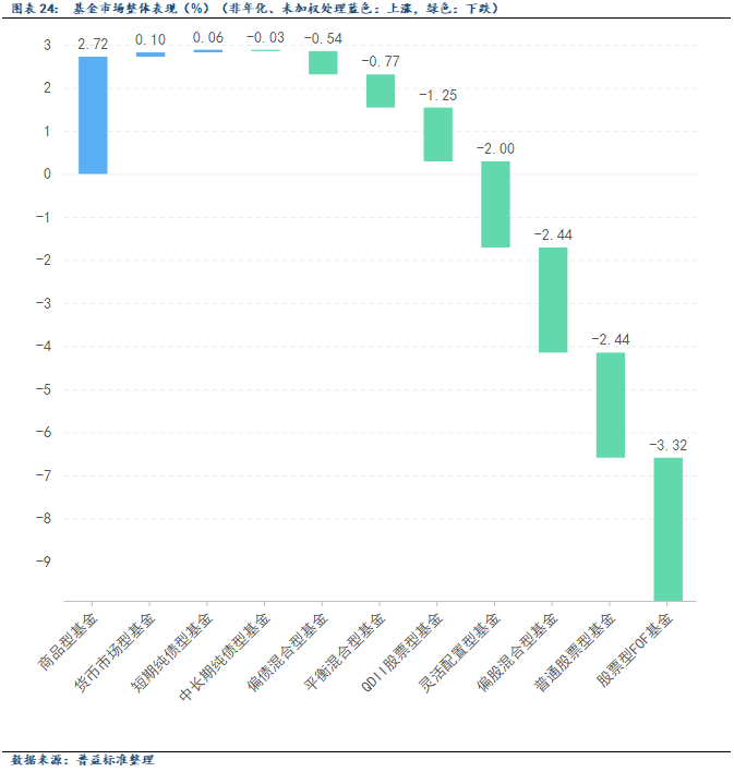 11月各类型基金收益整体多数收跌,商品型基金领涨,股票型FOF基金下跌幅度相对较大。11月,商品型基金涨幅相对较大,月内平均涨幅达2.72%,主要与11月黄金市场月内涨幅较大有关。11月上半月受美国政府停摆以及地缘政治扰动影响,金价呈现上行走势;随后月中以来美国政府停摆结束拉低避险需求,金价震荡走弱;月末受美联储降息预期升温带动,金价再度走高至相对高位,为商品型基金收益走高提供了一定的支撑。此外,股票型FOF基金、普通股票型基金、偏股混合型基金月内平均跌幅均超2.40%,或与当月下旬权益市场回调幅度相对较大有关。