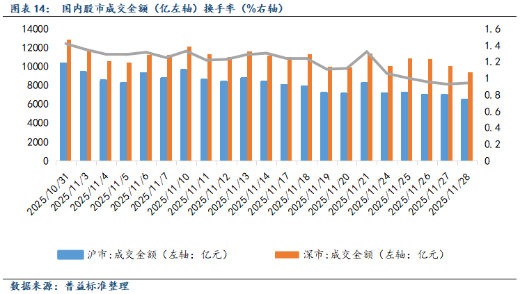 行业板块方面,11月申万一级行业指数多数下跌。其中纺织服饰、传媒和综合涨幅相对较大,分别为4.42%、4.12%和3.98%;电子、非银金融和有色金属板块跌幅相对较大,分别为-7.95%、-5.07%和-4.59%。其中纺织服饰板块表现相对较好,主要受中美贸易政策改善对服饰相关出口的提振,叠加季节转冷刺激保暖需求和“双十一”销售影响,相关板块涨势相对较好。而综合板块涨势也相对较好,或与其涵盖多元化、跨领域的市场板块有关,在当前市场波动行情下,综合板块因低估值、高股息及抗风险特性吸引资金,本月该板块上行趋势也较为明显。展望后续,随着增强消费品供需适配性政策的发布,以及各类新领域、新赛道应用场景的打造,相关消费及新质生产力等政策支持性板块或仍将预备一定的扩张动能,需持续关注后续政策执行情况。
